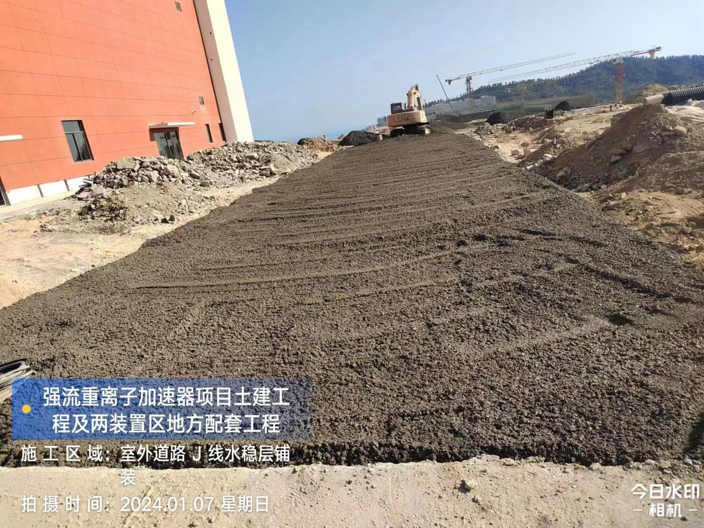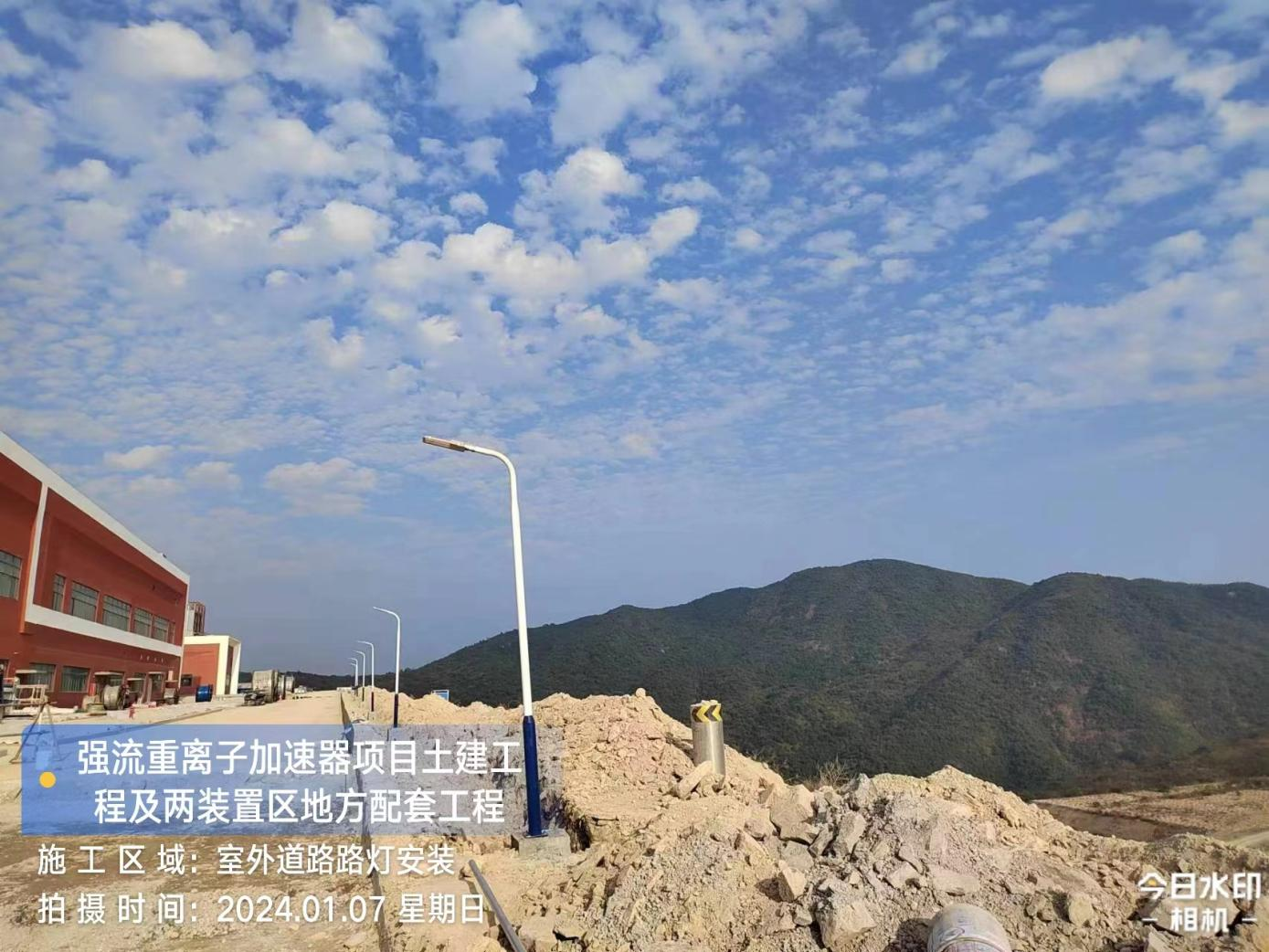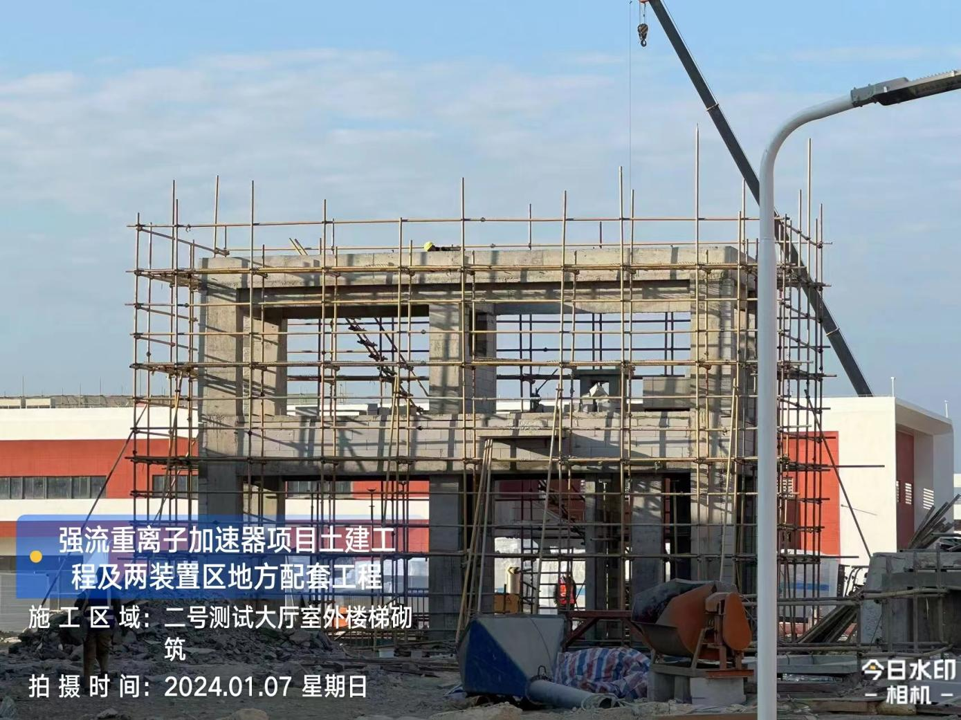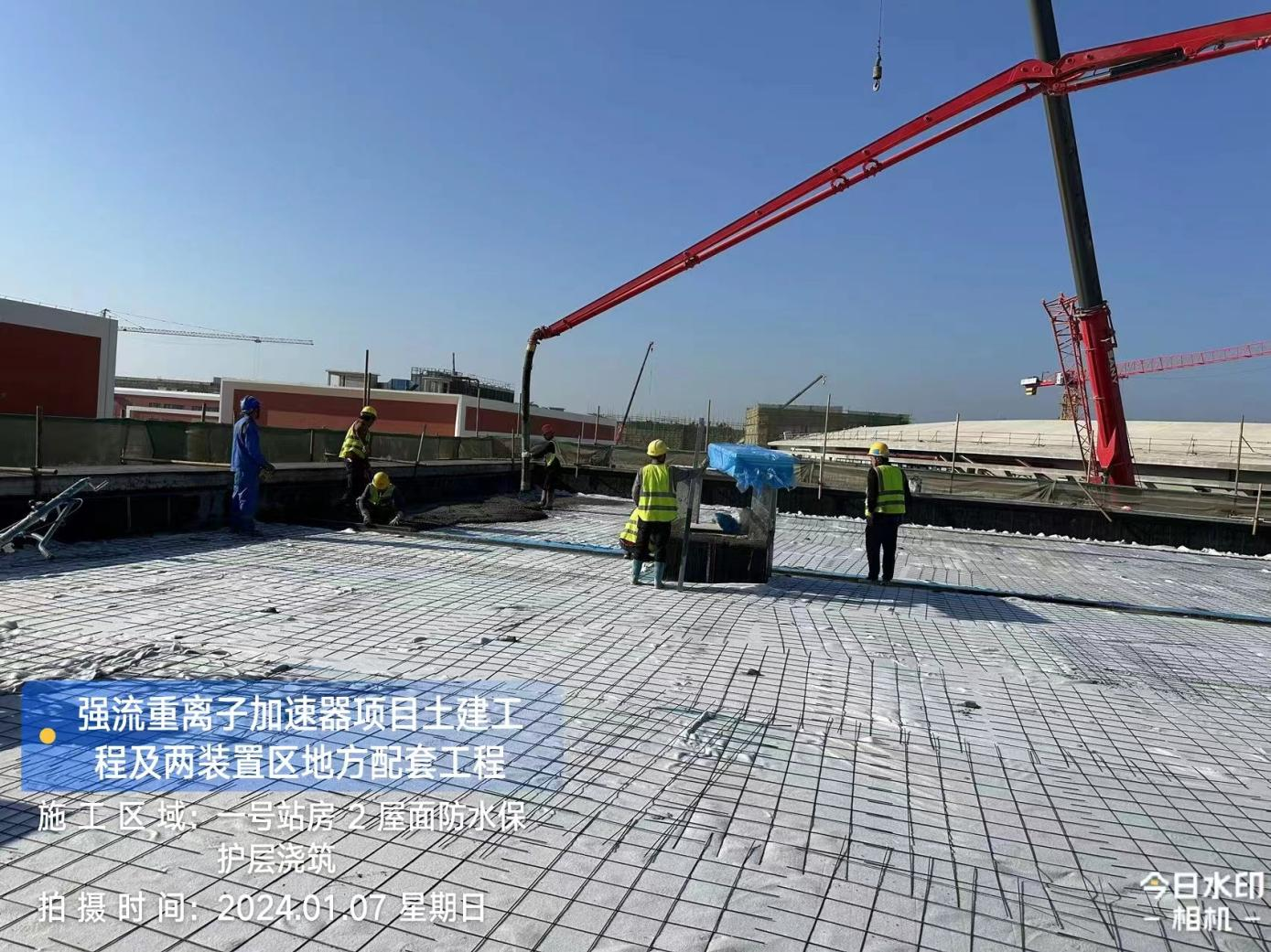 二、HIAF区其它单体:一号测试大厅PC1-2~4段外墙施工完成,外架拆除完成70%;PC1-9/10(1)段内架拆除完成;PC1-10(2)屋面梁、板模板支护完成80%。二号测试大厅室内地面浇筑完成90%,内环侧墙底漆完成90%。一号综合站房(1#)屋面钢筋绑扎完成,(2#)屋面防水保护层完成,内墙抹灰完成100%,(3#)墙体砌筑完成70%。直线设备楼(1#)13.15m标高屋面梁板模板完成100%,(2#)功率源设备间砌体完成60%。室外HIAF区路灯完成30个,后勤区路灯完成15个,消防车道D、J线水稳完成 100%,消防车道J线路缘石完成 80%,A线路缘石完成 30%。