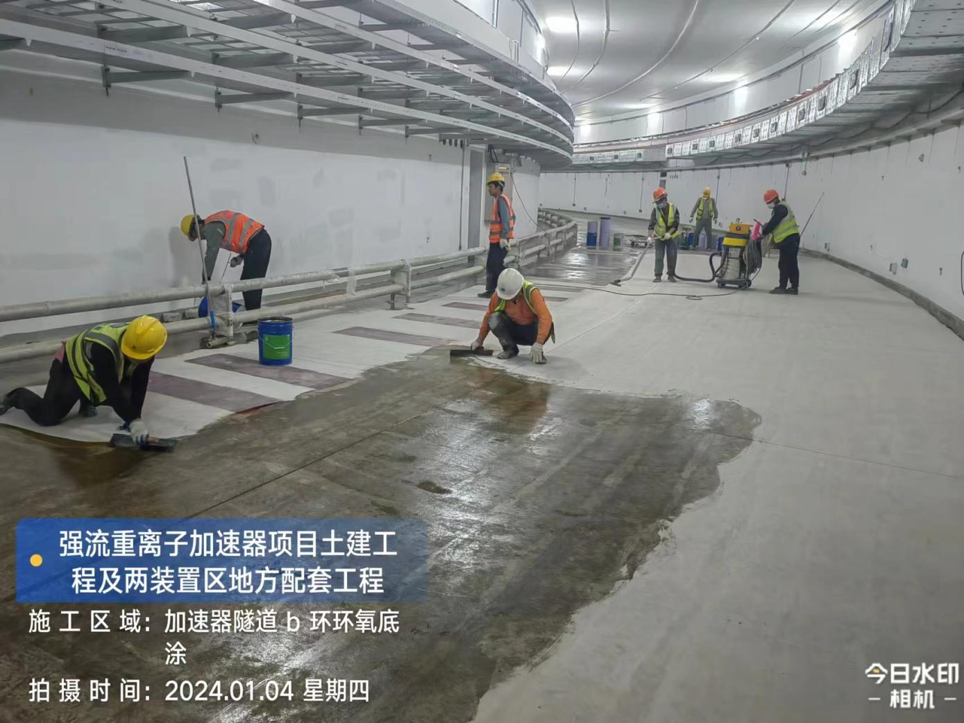 一、加速器隧道:B环地面中涂环氧地坪完成100%。H隧道地面中涂环氧地坪完成100%。