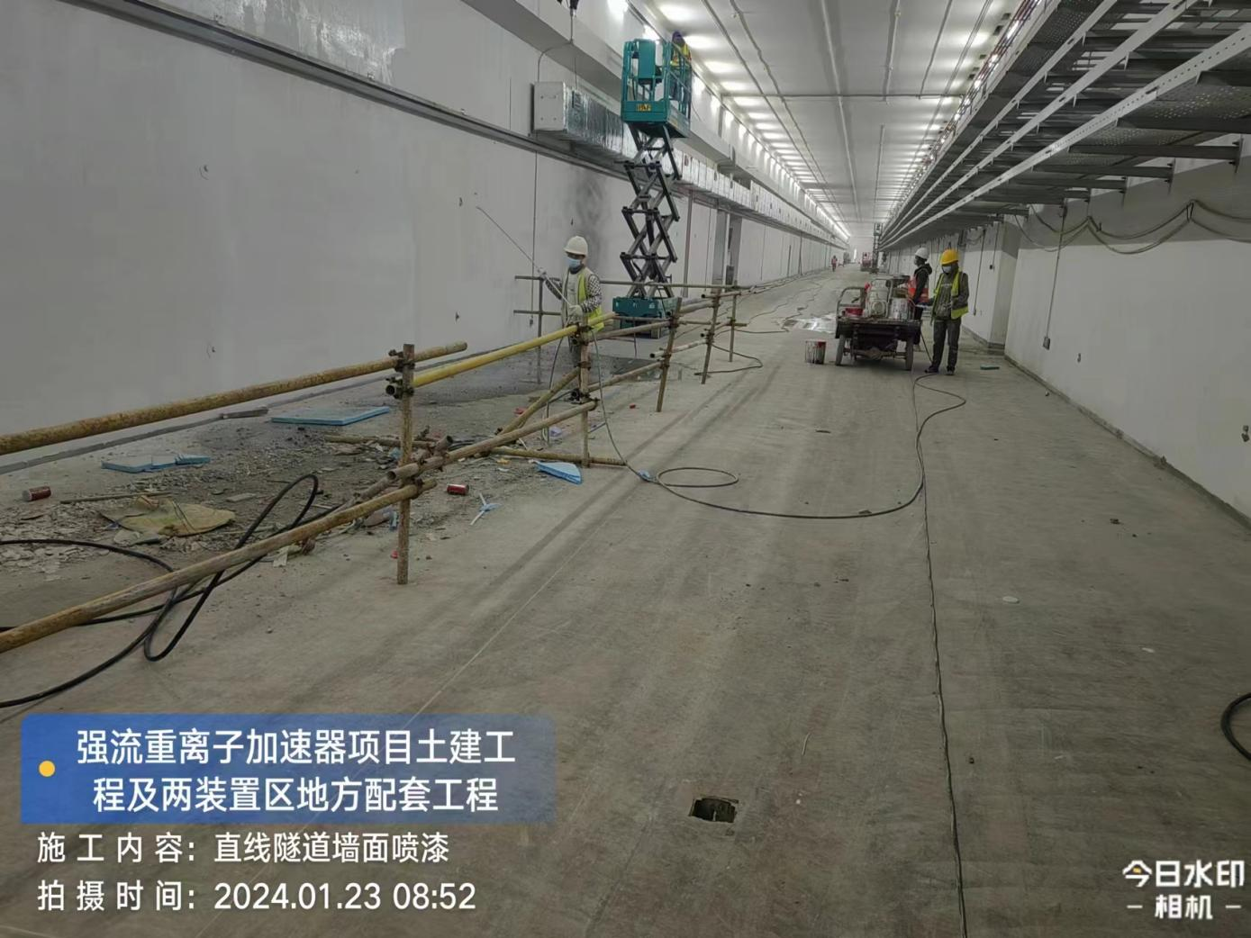 一、加速器隧道:直线隧道A1-1地上楼梯间出入口墙体砌筑完成70%,A1-1~8段墙面喷涂料完成100%,A1-9段墙面喷涂完成70%。S环隧道C3-1地上楼梯间出入口窗框安装完成。B环隧道地坪环氧面漆完成95%。H隧道地坪环氧面漆完成90%。