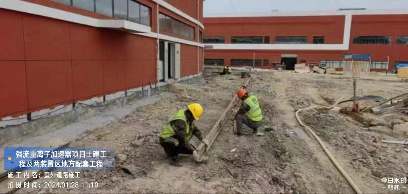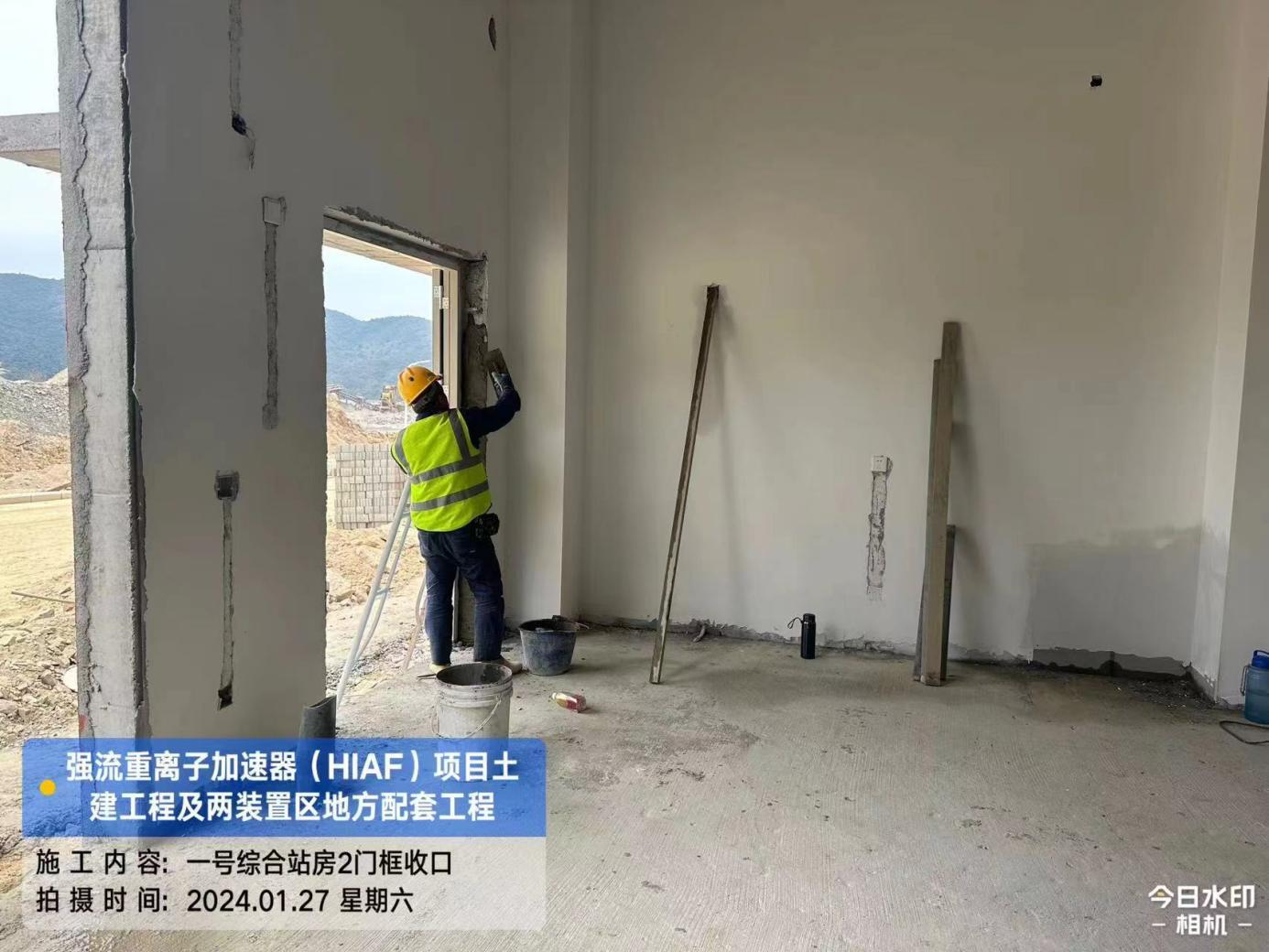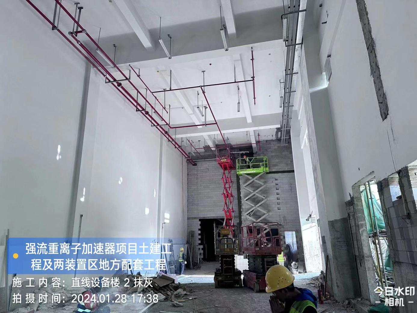 二、HIAF区其它单体:一号测试大厅PC1-1~7段防火门扇安装完成;PC1-1~9段防火门安装完成,门扇安装完成80%;PC1-1~8段铝合金门框安装完成95% ;PC18轴及PC59轴卫生间内卫生洁具安装完成;PC1-1段外环油漆涂料完成80%;PC1-6段高跨外墙油漆涂料完成100%,外架拆除完成;PC1-8/9段外环侧墙第二道腻子完成100%;PC1-8段外环墙面底漆完成,中涂漆完成20%;PC1-9段内环侧墙油漆涂料完成100%,电缆沟砌筑完成,墙体砌筑完成95%,抹灰完成95%,腻子完成90%;PC1-10(2)段屋面防水保护层浇筑完成,内架拆除完成,墙体砌筑完成30%,墙体抹灰完成15%,墙面腻子完成10%。二号测试大厅通道腻子油漆涂料完成100%。一号综合站房(1#)墙体砌筑完成20%,顶棚腻子完成10%;(2#)墙体砌体完成85%,外墙抹灰完成 30%,内墙腻子完成60%。直线设备楼(1#)高跨内架拆除完成,墙体砌体完成30%;(2#)功率源设备间夹层板浇筑完成90%,墙体砌筑完成80%,内墙一体化腻子完成20%。室外道路FX线道路(一号测试大厅内环)混凝土浇筑完成80%,一号测试大厅内侧入户坡道完成80%,RX线道路混凝土浇筑完成,E线道路KO+080~120段水稳层浇筑完成,二号测试大厅入户人行道完成60%,一号测试大厅外环排水沟砌筑完成20%。市政配套设施高杆灯安装16个。
