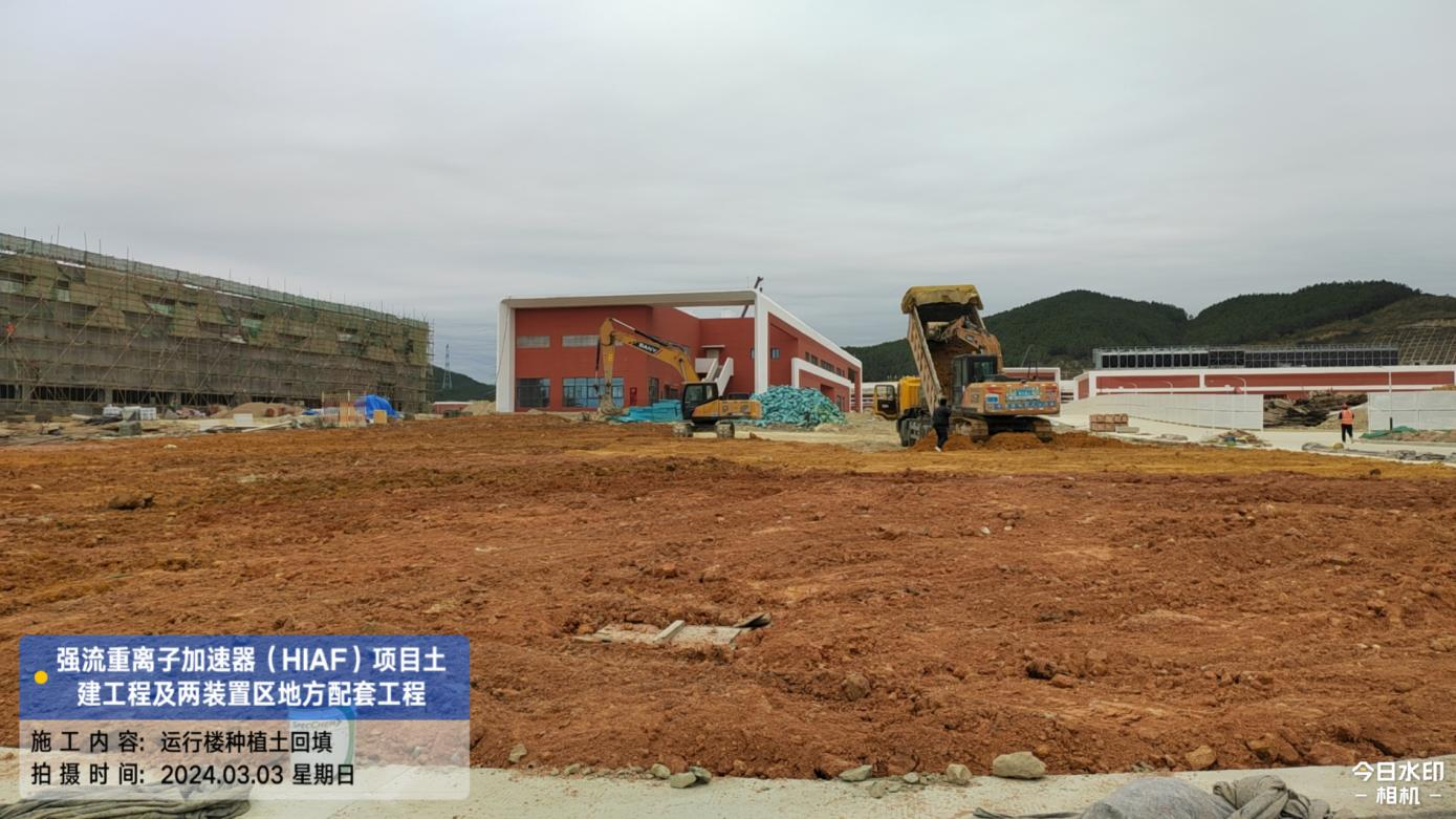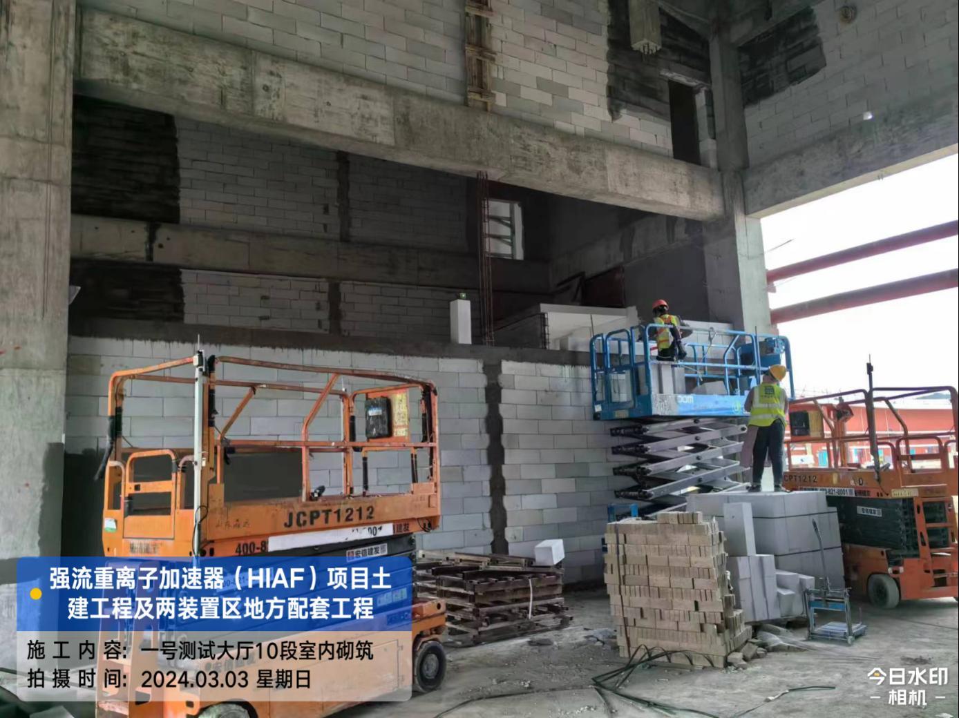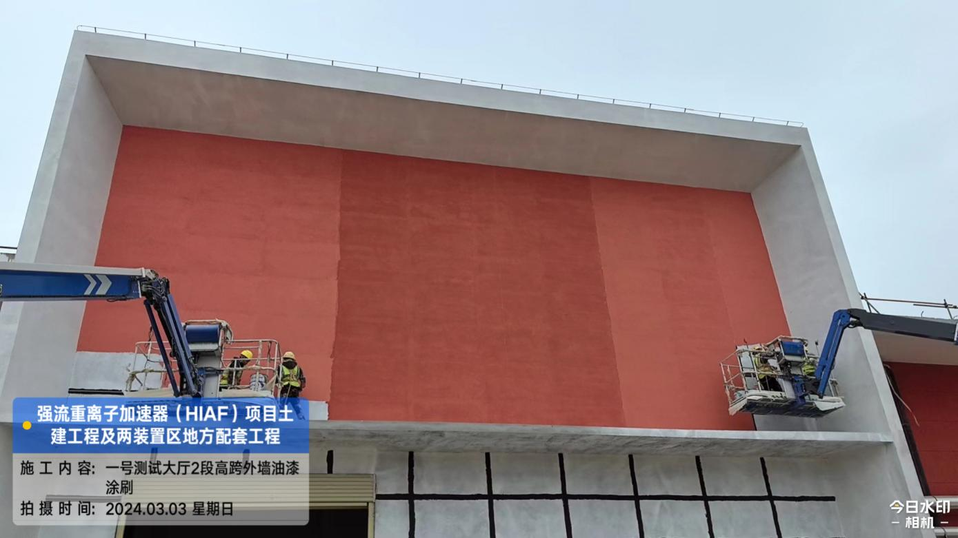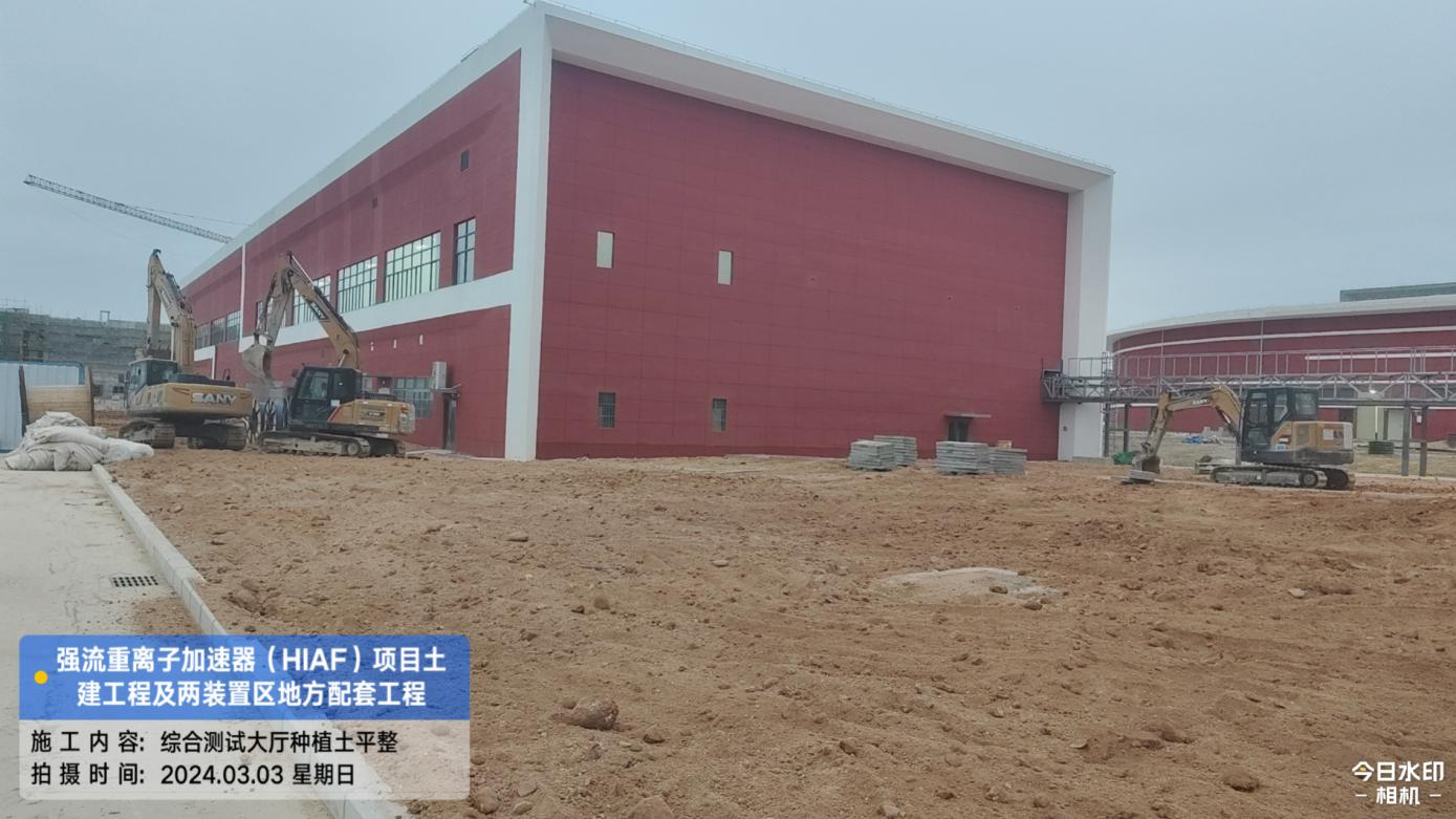 二、HIAF区其它单体:一号测试大厅PC1-10段砌筑完成85%,PC1-9段室内地面浇筑完成,PC1-2段高跨外墙油漆完成40%。二号测试大厅外墙油漆修补完成20%,室外楼梯钢爬梯安装完成,室外楼梯窗户塞缝打胶完成40%。一号综合站房1#内架材料清理完成,楼梯扶手安装完成;2#/3#钢爬梯安装完成。直线设备楼2#空调机房地坪浇筑完成,水泵房水沟砌筑、设备基础浇筑完成,配电室电缆沟砌筑完成,气体灭火间墙封堵完成。室外工程一号测试大厅内环排水沟砌筑完成70%,外环排水沟砌筑完成30%,内环道路浇筑完成;二号测试大厅内环排水沟砌筑完成70%;运行楼室外种植土回填完成50%;综合测试大厅室外种植土平整完成;直线设备楼2#H线KO+210~270道路浇筑完成,B03室外智能化电缆沟开挖。