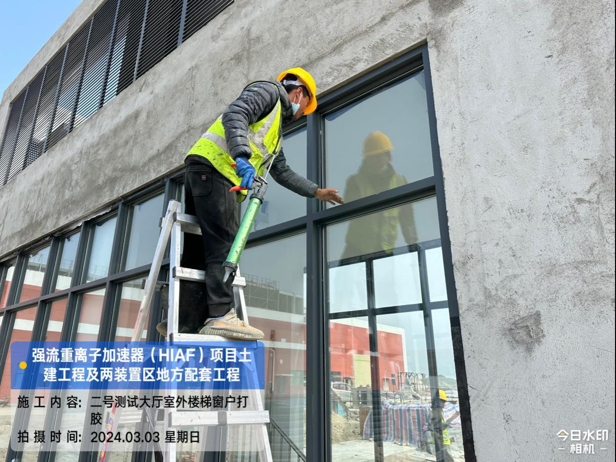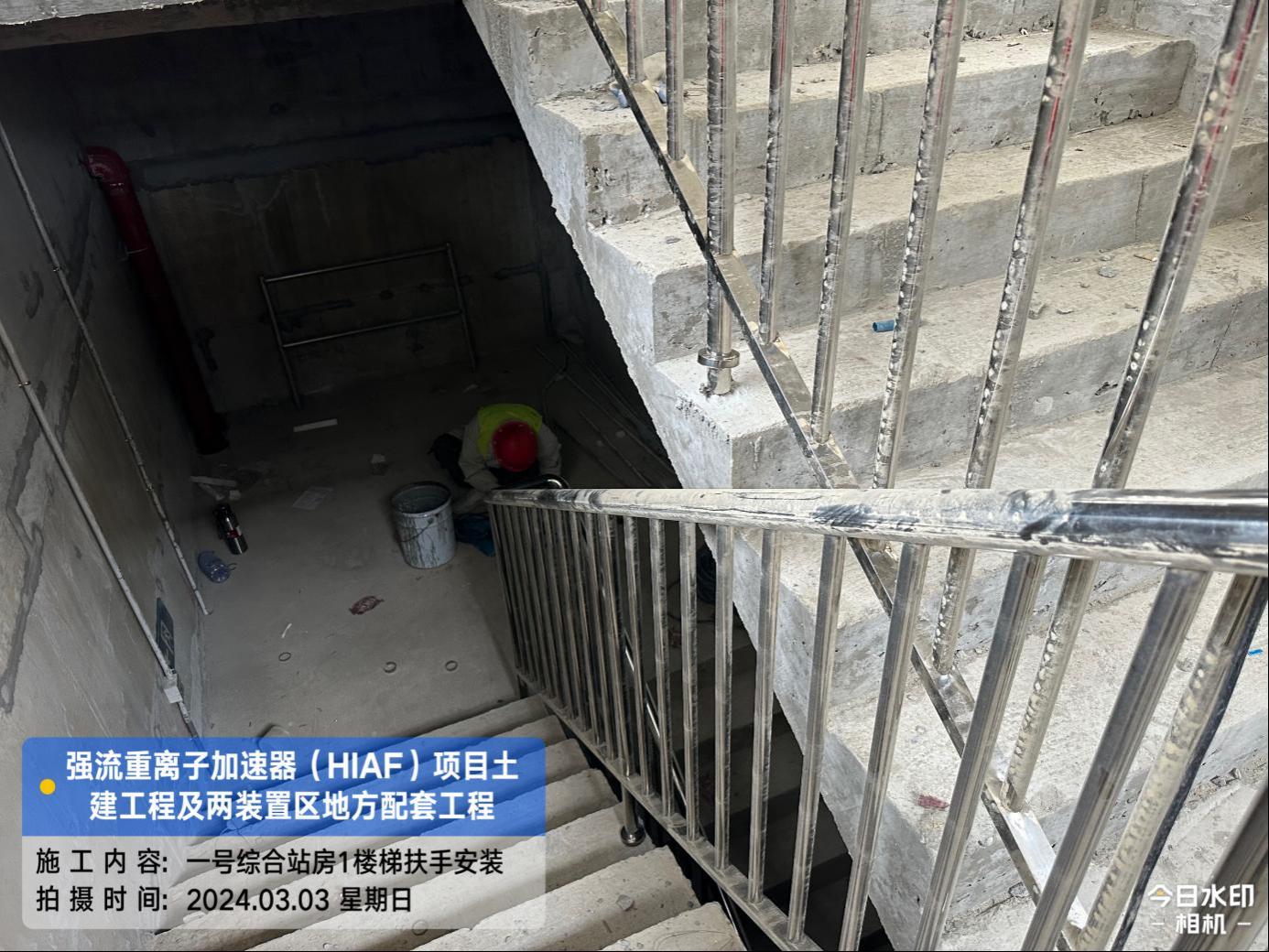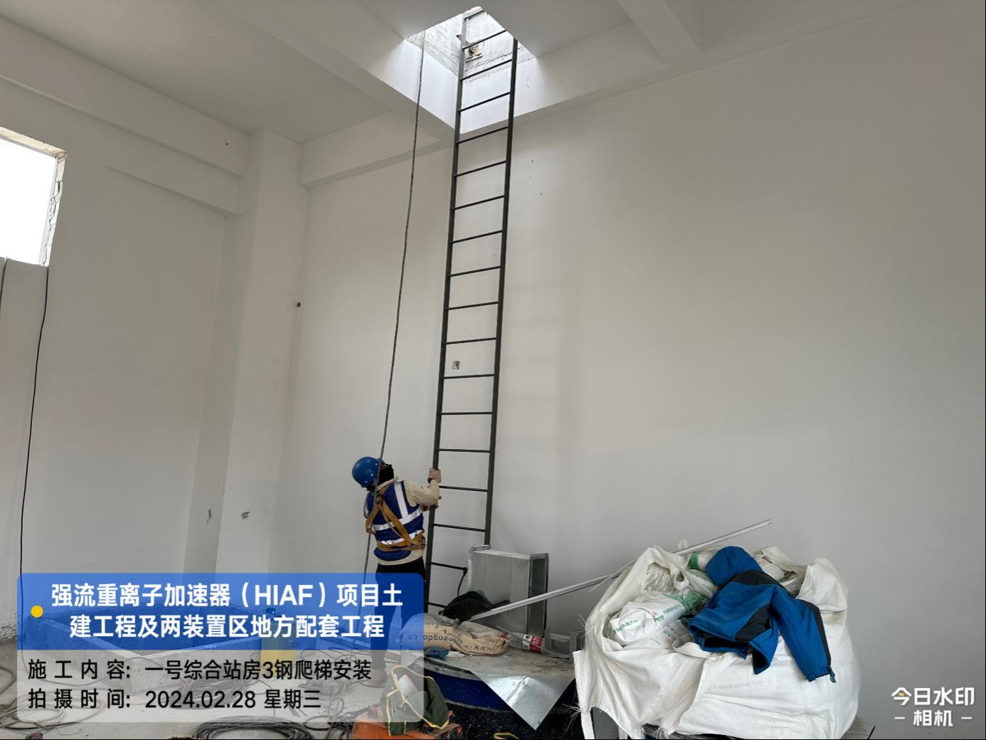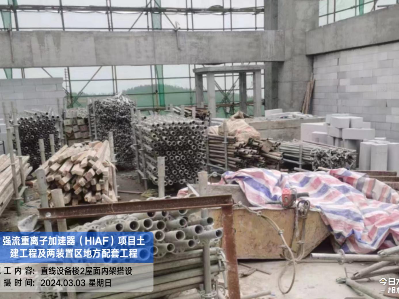 二、HIAF区其它单体:一号测试大厅PC1-10段砌筑完成85%,PC1-9段室内地面浇筑完成,PC1-2段高跨外墙油漆完成40%。二号测试大厅外墙油漆修补完成20%,室外楼梯钢爬梯安装完成,室外楼梯窗户塞缝打胶完成40%。一号综合站房1#内架材料清理完成,楼梯扶手安装完成;2#/3#钢爬梯安装完成。直线设备楼2#空调机房地坪浇筑完成,水泵房水沟砌筑、设备基础浇筑完成,配电室电缆沟砌筑完成,气体灭火间墙封堵完成。室外工程一号测试大厅内环排水沟砌筑完成70%,外环排水沟砌筑完成30%,内环道路浇筑完成;二号测试大厅内环排水沟砌筑完成70%;运行楼室外种植土回填完成50%;综合测试大厅室外种植土平整完成;直线设备楼2#H线KO+210~270道路浇筑完成,B03室外智能化电缆沟开挖。