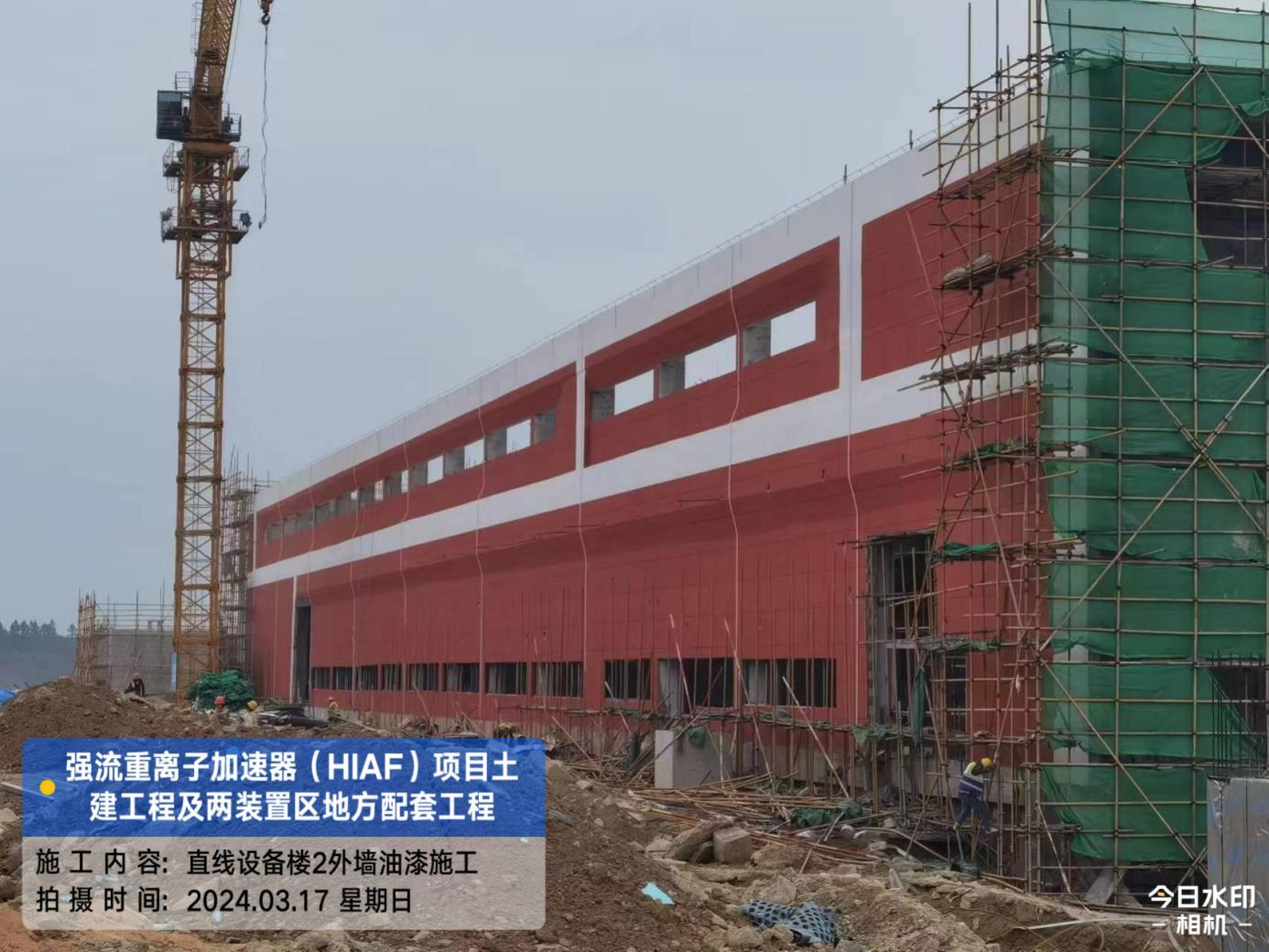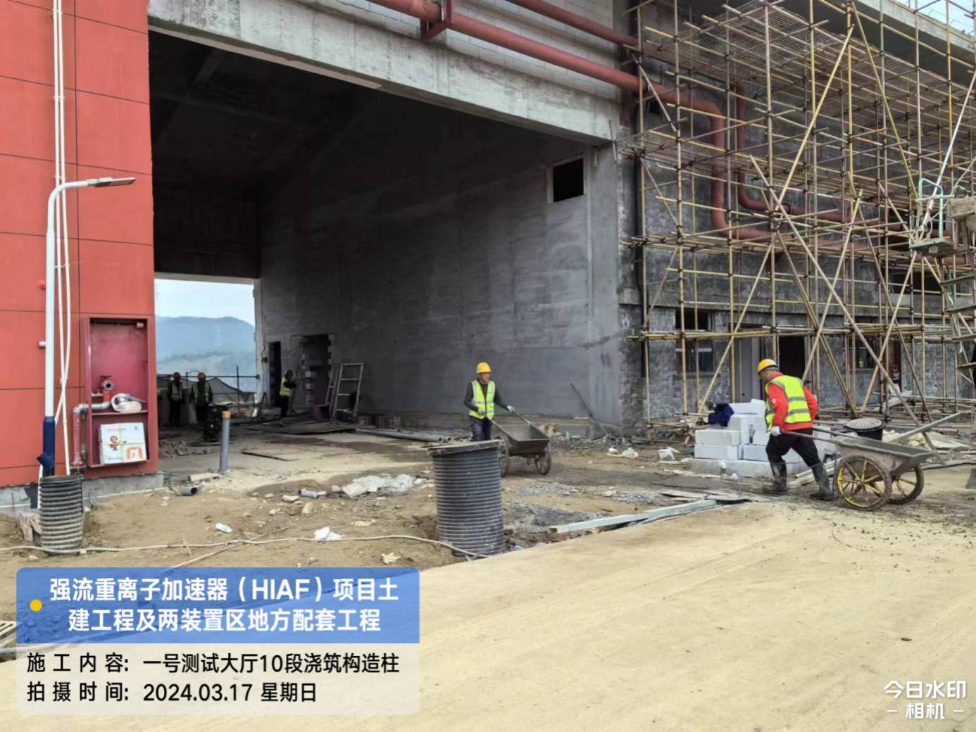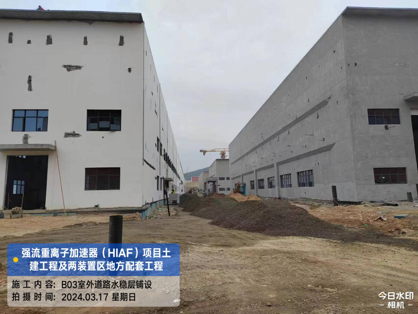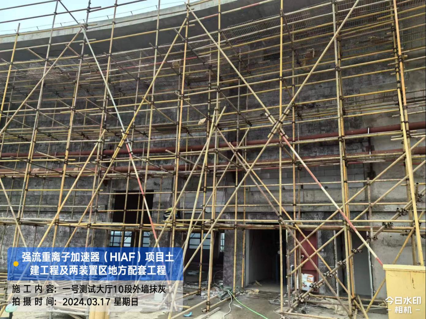 二、HIAF区其它单体:一号测试大厅PC1-10段砌筑完成95%,内墙抹灰、腻子完成90%,内环外墙抹灰完成90%,地坪浇筑完成;PC1-9段腻子修补完成85%;PC1-2段高跨南北两侧外墙油漆完成。二号测试大厅外环外墙油漆修补完成80%,冷却水设备间施工洞口封堵完成60%。一号综合站房(1#)墙体砌筑完成45%,顶棚腻子完成60%;(2#、3#)设备基础浇筑完成,窗框、门框安装完成。直线设备楼(1#)墙体砌筑完成70%,顶棚腻子完成60%,外墙抹灰完成10%;(2#)墙体砌筑完成,室内腻子完成95%,外墙抹灰完成95%,西侧外墙防水腻子完成70%,西侧外墙底涂完成50%,配电室地坪浇筑完成。值班楼电梯前室洞口改窗墙体砌筑完成。科学之门外步行道踏步混凝土浇筑完成。室外一号测试大厅内环绿化种植土回填完成,内环道路灯杆安装完成,外环人行道浇筑完成60%;综合测试大厅草籽播种完成70%;二号测试大厅种植土回填完成80%、人行道浇筑完成;B03室外道路BH K0+160~380段水稳层铺设完成,智能化电缆沟完成50%。
