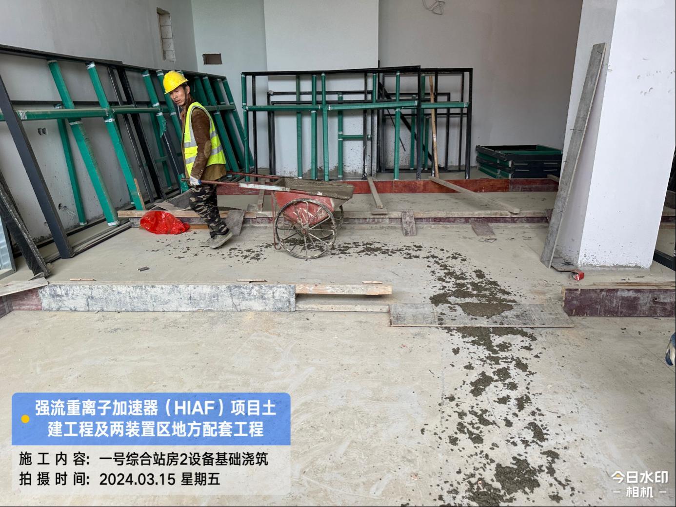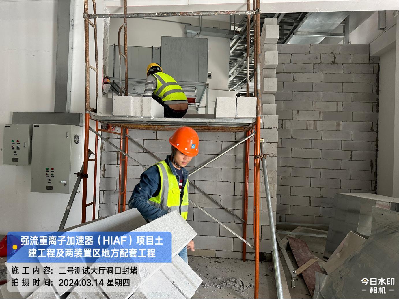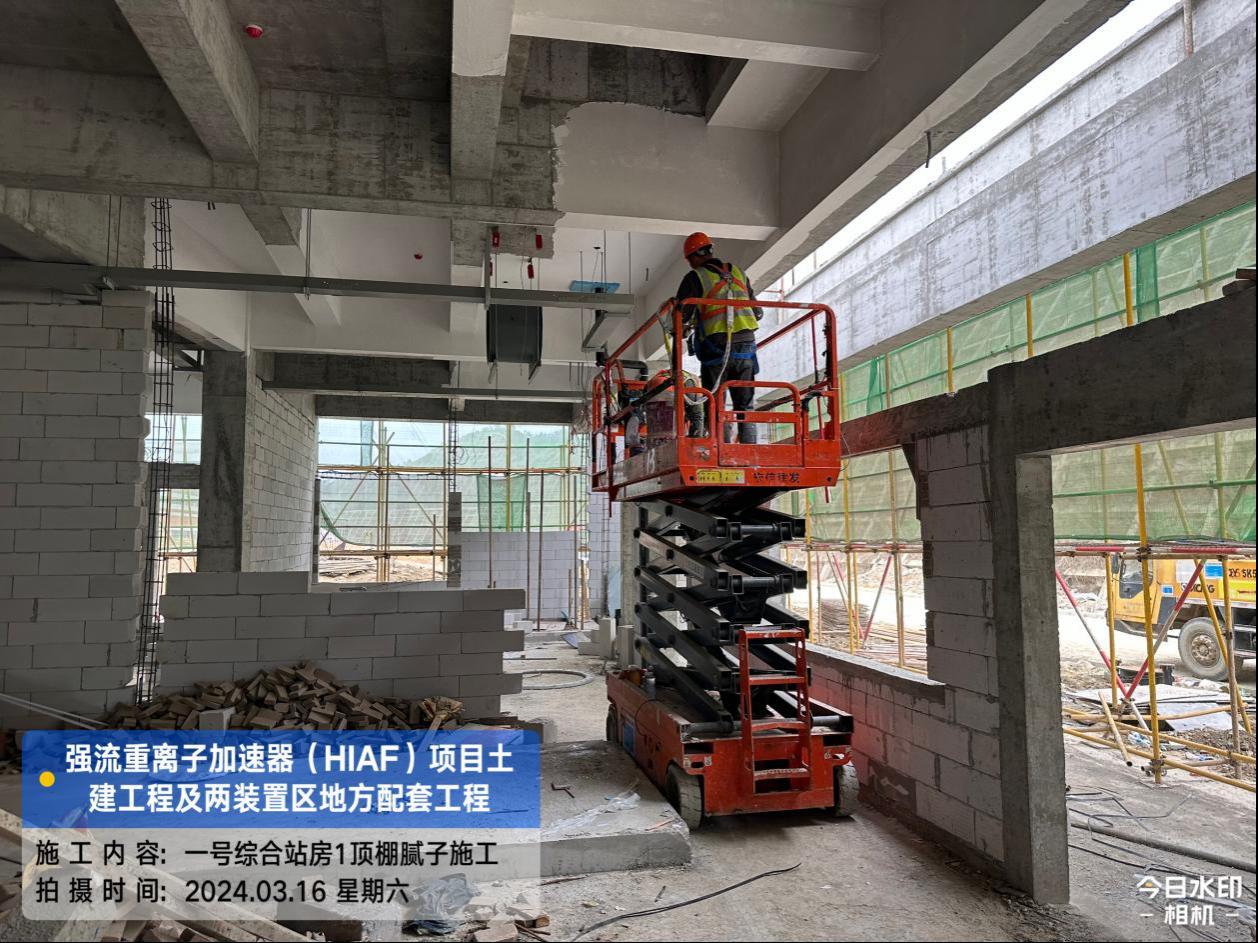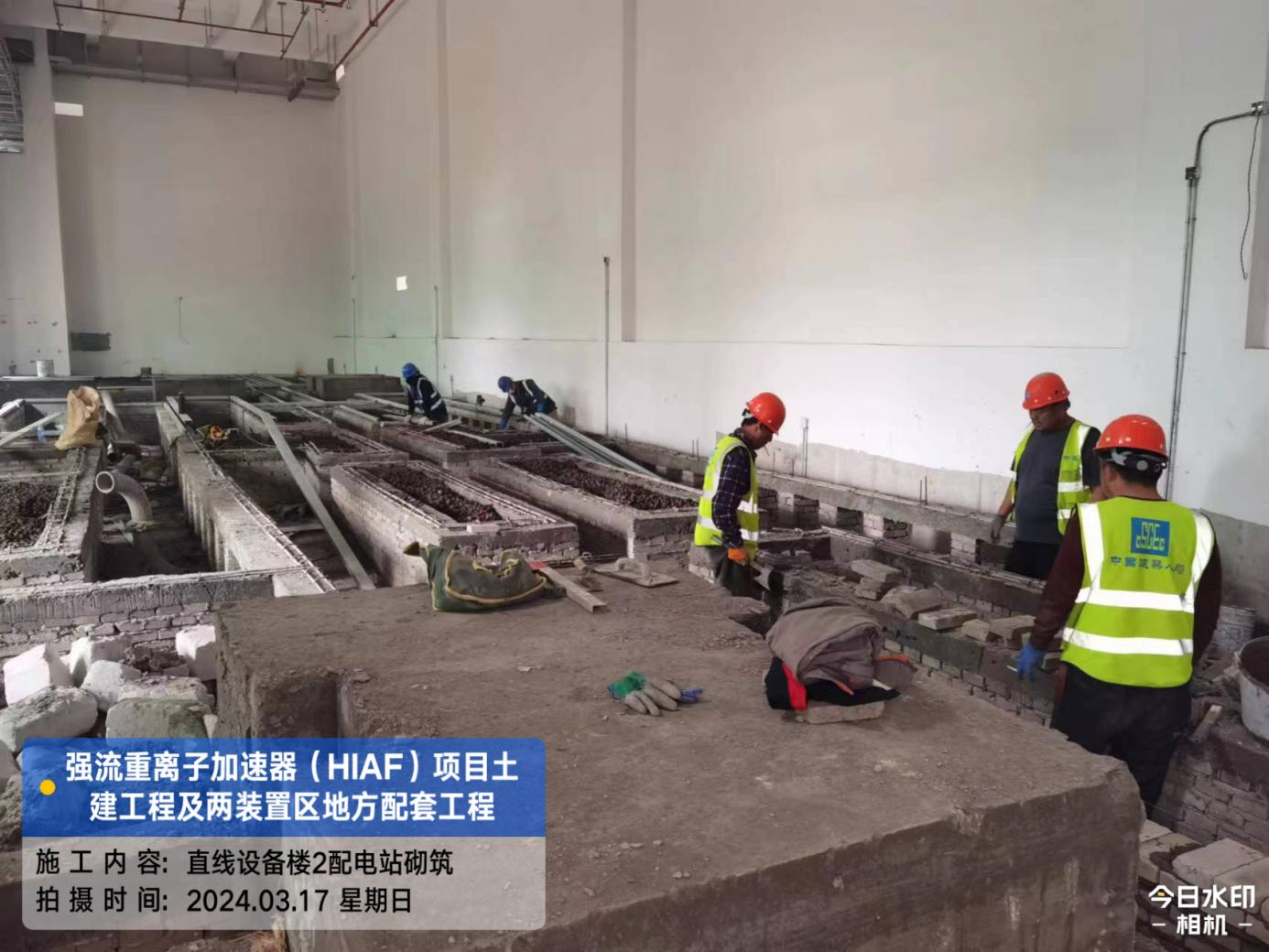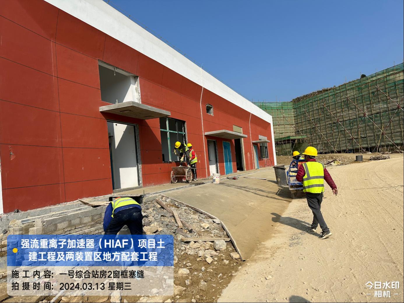 二、HIAF区其它单体:一号测试大厅PC1-10段砌筑完成95%,内墙抹灰、腻子完成90%,内环外墙抹灰完成90%,地坪浇筑完成;PC1-9段腻子修补完成85%;PC1-2段高跨南北两侧外墙油漆完成。二号测试大厅外环外墙油漆修补完成80%,冷却水设备间施工洞口封堵完成60%。一号综合站房(1#)墙体砌筑完成45%,顶棚腻子完成60%;(2#、3#)设备基础浇筑完成,窗框、门框安装完成。直线设备楼(1#)墙体砌筑完成70%,顶棚腻子完成60%,外墙抹灰完成10%;(2#)墙体砌筑完成,室内腻子完成95%,外墙抹灰完成95%,西侧外墙防水腻子完成70%,西侧外墙底涂完成50%,配电室地坪浇筑完成。值班楼电梯前室洞口改窗墙体砌筑完成。科学之门外步行道踏步混凝土浇筑完成。室外一号测试大厅内环绿化种植土回填完成,内环道路灯杆安装完成,外环人行道浇筑完成60%;综合测试大厅草籽播种完成70%;二号测试大厅种植土回填完成80%、人行道浇筑完成;B03室外道路BH K0+160~380段水稳层铺设完成,智能化电缆沟完成50%。