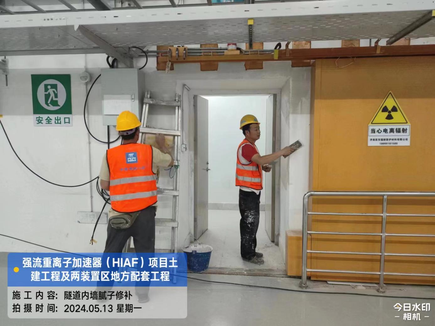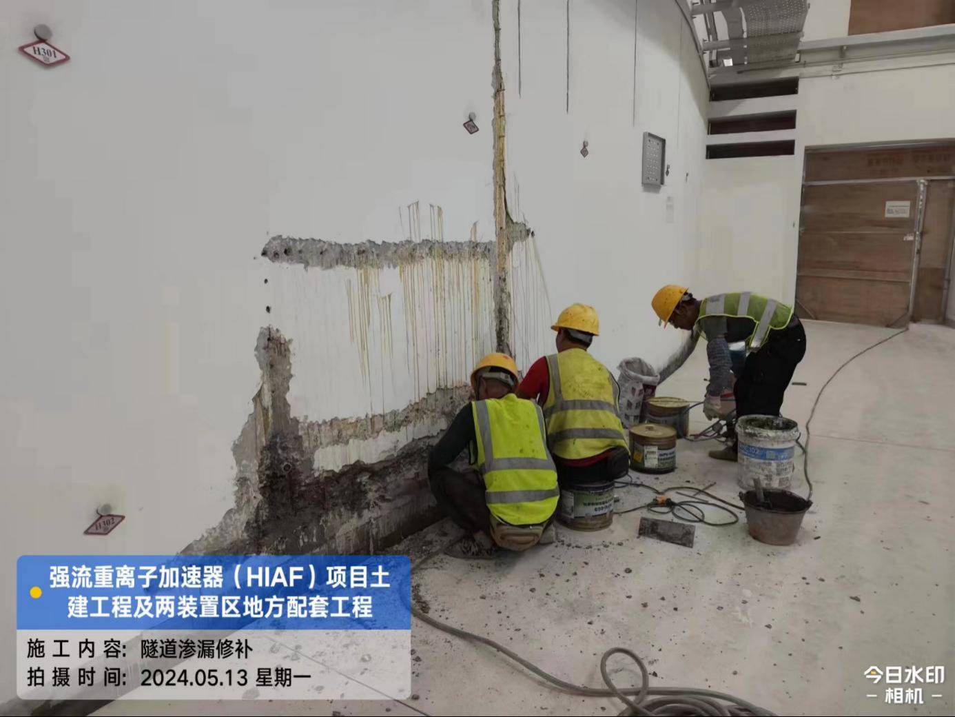 一、加速器隧道:直线隧道渗漏处理完成100%,墙面涂料恢复完成50%。B环渗漏处理完成100%。S环渗漏处理完成100%。H隧道渗漏处理完成100%;C2-1段人员进出口不锈钢门安装完成100%。