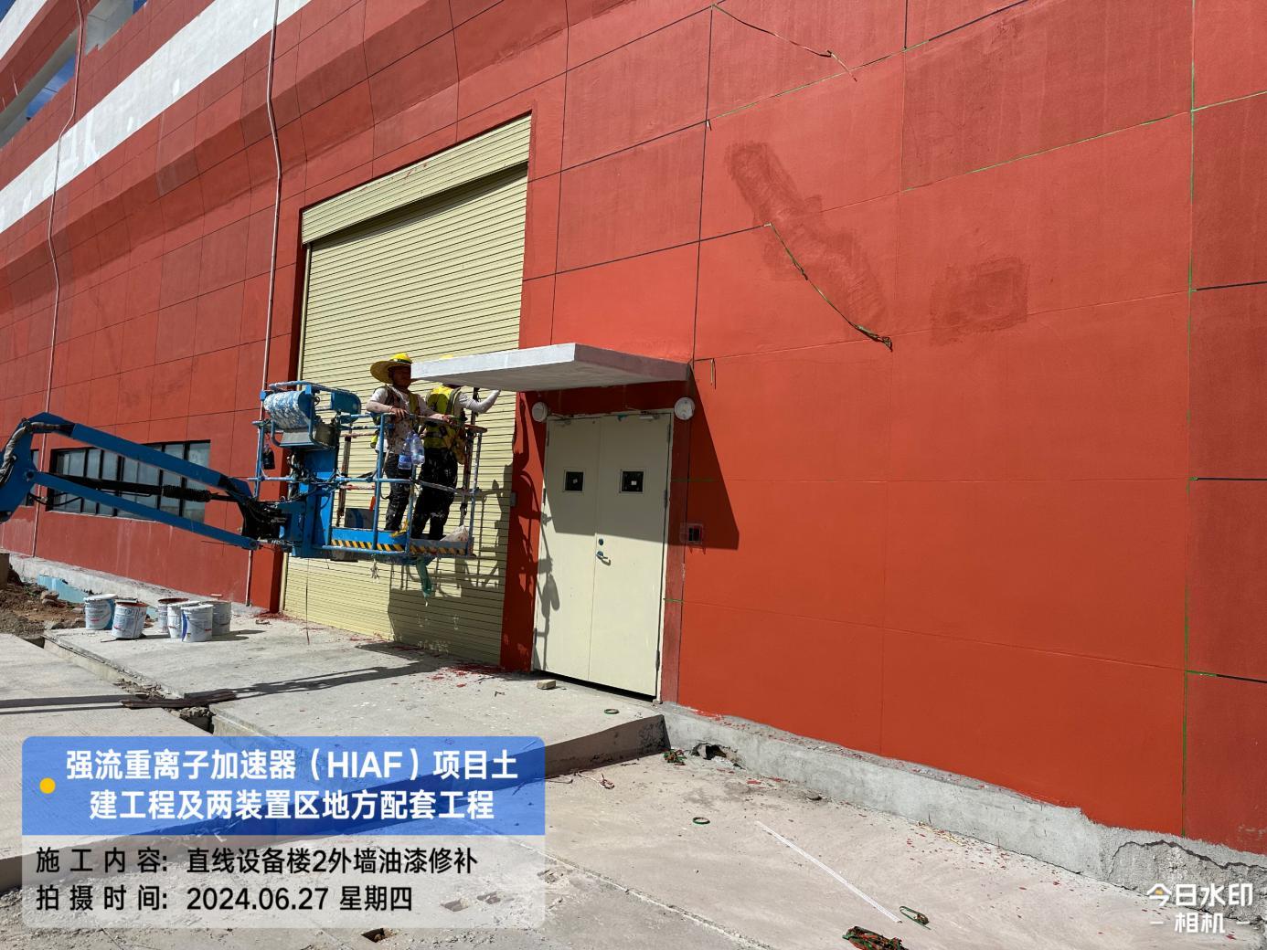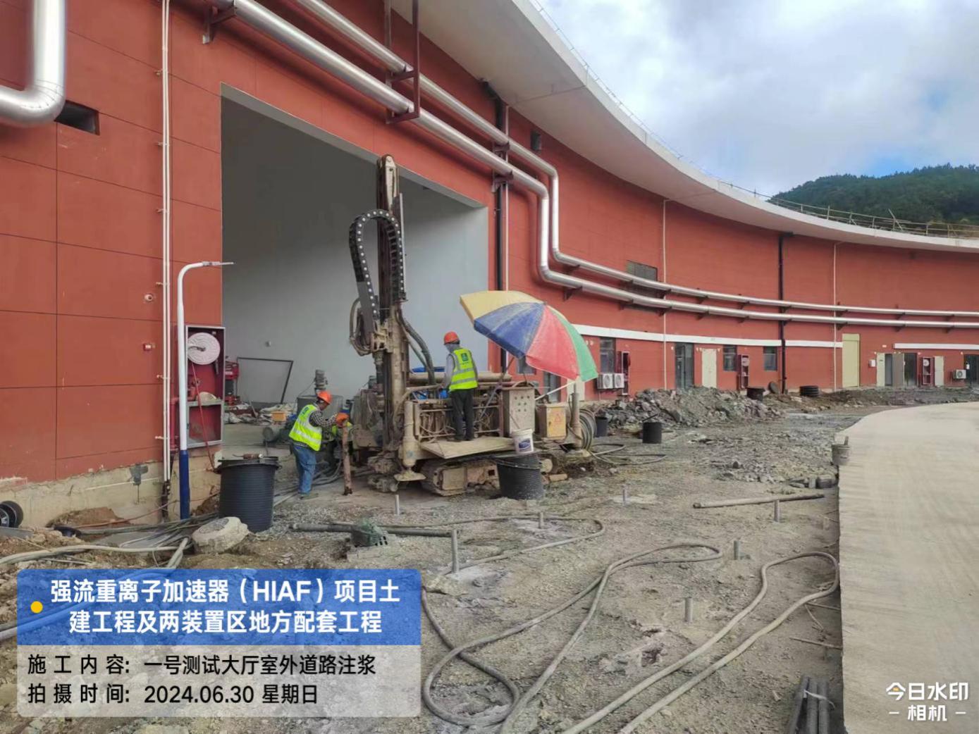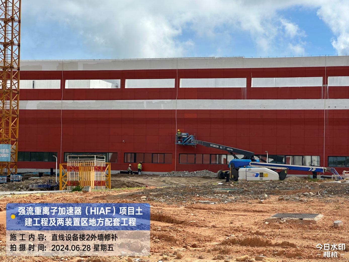 二、HIAF区其它单体:综合管廊水沟角铁安装完成10%,墙底踢脚线施工完成50%。一号综合站房(1#)外墙油漆修补完成80%,屋面防水完成30%。室外一号测试大厅内环道路注浆完成100%;一号综合站房新增悬臂式挡土墙混凝土浇筑完成100%(变更);一号测试大厅外环新增悬臂式挡墙开挖完成50%(变更);直线设备楼(2#)新增挡墙第二段混凝土浇筑完成50%(变更);B06、08、09智能化电缆沟侧墙浇筑完成100%;综合测试大厅新增排水沟混凝土浇筑完成80%(变更)。