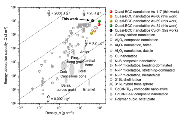 图1:金和铜准体心立方纳米梁晶格和已报道的微/纳米梁晶格力学超材料的单位体积能量吸收与密度的阿什比图(图源/近代物理所)