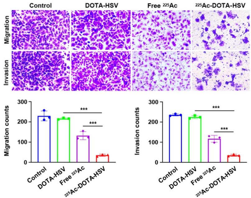 图: Ac-225标记多肽抑制非小细胞肺癌A549细胞迁移和侵袭能力(***p < 0.001);DOTA-HSV,靶向多肽组;Free 225Ac,游离225Ac组;225Ac- DOTA-HSV,225Ac标记靶向多肽组