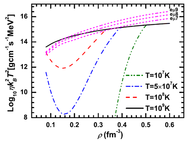 近日,中科院近代物理研究所的科研人员首次阐明了核子短程关联在核物质热导率及剪切黏滞性中的作用,进而说明了其在中子星输运性质及r-模不稳定性中的作用。科研人员利用微观多体BHF理论,并采用现实核力AV18及微观三体核力,自洽地计算了输运性质所需要的费米面处的单粒子强度、介质中的微分截面、核子有效质量以及状态方程等。结果表明,对于对称核物质、纯中子物质和β-稳定物质,当考虑核子短程关联时,输运系数都提高了数倍(如图1所示)。对于不同的密度和温度,无论是否包含短程关联,核子热导率都比轻子热导率更重要。随着温度的降低,相对于轻子,核子的剪切黏滞性变得越来越重要。如果考虑短程关联,核子的剪切黏滞性在中等密度区域与轻子相当,在低密度时超过轻子。研究还发现,与短程关联的作用相反,一旦低于核子超流的临界温度,中子的超流性会使得核子的黏滞性降低几个数量级(如图2所示)。在低温下的核子超流性存在的密度区域,轻子散射对剪切黏滞性的贡献仍然比核子散射的贡献重要。