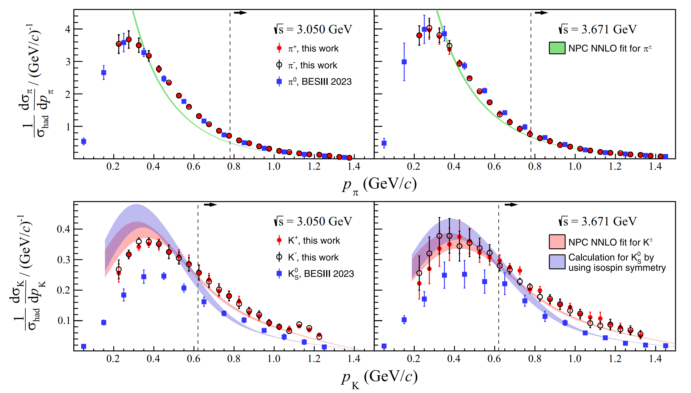 面对这一挑战,团队利用北京谱仪(BESIII)能量扫描数据,精确测量了带电pion和Kaon介子单举产生微分截面,最高精度达1%~2%。结合NPC合作组(Non-perturbative Physics Collaboration)的全局数据拟合研究,这一新的测量结果与基于次次领头阶(NNLO)精度的量子色动力学(QCD)理论分析相符合,尤其是大动量强子区域(如图2所示)。该研究成果为检验低能区QCD因子化定理及部分子碎裂过程中同位旋对称性的有效性提供了有力的实验支持,对深入理解强相互作用动力学具有重要意义。