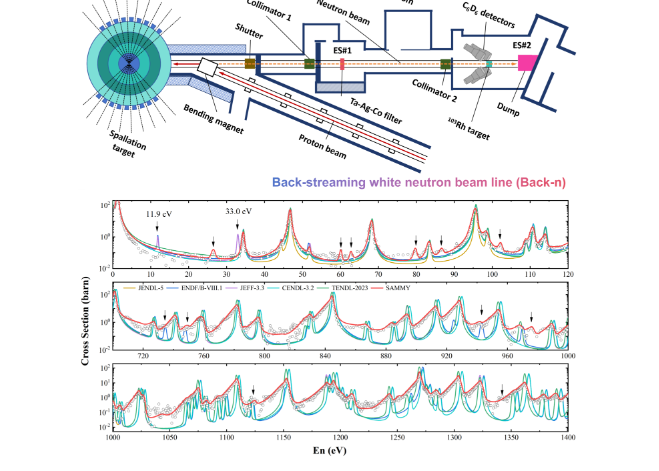 在中子俘获反应研究方面,研究团队基于中国散裂中子源反角白光中子束线(CSNS Back-n),利用高纯度铑-103靶材开展了1eV-1MeV能区中子俘获反应截面的直接测量。实验结果表明,国际主要评价数据库ENDF/B-VIII.1,JEFF-3.3和JENDL-5中11.9 eV和33.0 eV处标注的共振能级并不存在。分析认为,上述数据库中的共振峰可能源于早期实验样品中铂族元素钯(108Pd)与铂(195Pt)杂质的贡献。此外,基于CSNS Back-n束流的高注量率和优异的飞行时间分辨能力,本次实验首次发现了铑-103的8个新共振峰,并利用R-矩阵程序SAMMY提取了相应的共振参数。